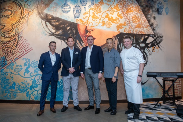 Từ trái sang: Ông Thierry (Giám đốc ẩm thực) - Khách mời - Ông Eddy Sarton ( Tổng quản lý khách sạn New World Sài Gòn) - Ông Tony Guo (Bếp trưởng bếp Hoa) và Ông James Williams (Bếp trưởng khách sạn New World Sài Gòn) trong lễ khai trương nhà hàng Black Vinegar
