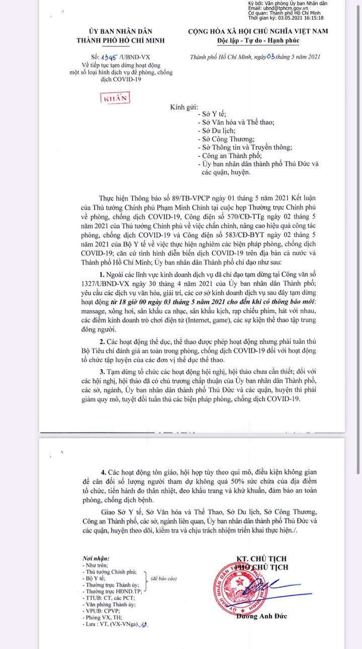 1. Ngoài các lĩnh vực kinh doanh dịch vụ ( karaoke, vũ trường và quán bar) đã chỉ đạo tạm dừng tại Công văn số 1327/UBND-VX ngày 30 tháng 4 năm 2021 của Ủy ban nhân dân Thành phố, yêu cầu các dịch vụ văn hóa, giải trí, các cơ sở kinh doanh dịch vụ sau đây tạm dừng hoạt động từ 18 giờ 00 ngày 03 tháng 5 năm 2021 cho đến khi có thông báo mới: massage, xông hơi, sân khấu ca nhạc, sân khấu kịch, rạp chiếu phim, hát với nhau, các điểm kinh doanh trò chơi điện tử (Internet, game), các sự kiện thể thao tập trung đông người.