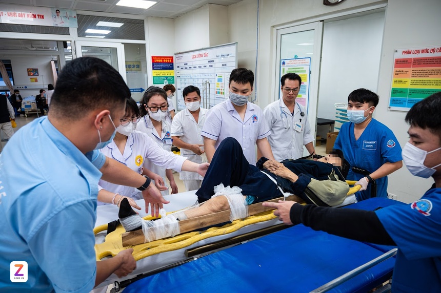 Bác sĩ Bệnh viện Trung ương Quân đội 108 cấp cứu cho bệnh nhân. Ảnh: Việt Linh.